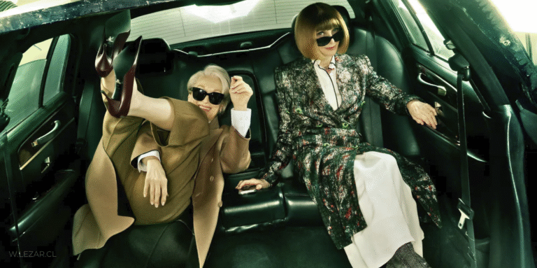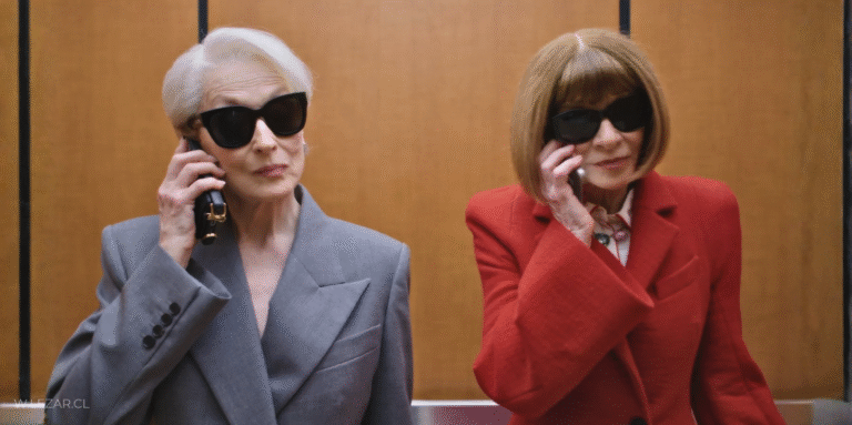 No es solo ver a Wintour finalmente en portada de Vogue, es que a su lado, Meryl Streep aparece en su rol de Miranda Priestly, un personaje que, aunque inspirado libremente en Wintour, terminó construyendo su propia mitología dentro de la cultura popular. La presencia de Greta Gerwig como moderadora añade otra capa: cine, moda y narrativa convergen sin esfuerzo.