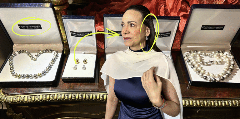 En joyería, Erik Alexander respondió con una mezcla poco común de rapidez, sensibilidad y oficio. A partir de la línea visual que le propuse para complementar la imagen de María Corina Machado, ensambló en tiempo récord una propuesta especial con perlas japonesas, perlas de Tahití, oro blanco, oro amarillo y brillantes. Desarrolló cuatro pares de pendientes y tres sets de collares, siempre en diálogo con la sobriedad, la luz y la elegancia contenida que buscábamos sostener. De esa selección salieron las piezas con perlas grises y brillantes que acompañaron buena parte de la agenda, además de los pendientes en forma de gota elegidos para La Moneda. Aunque los collares no llegaron a utilizarse por cuestiones de tiempo, sí formaron parte de una propuesta que María Corina recibió con especial emoción, conmovida por la generosidad con la que el joyero chileno puso su trabajo al servicio de este momento.