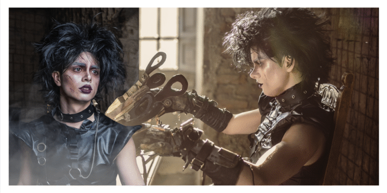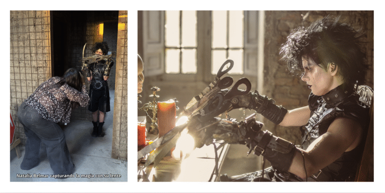 El vestuario creado por el diseñador y periodista de moda Jesús Alcalá (@jesusalcaladice) es el puente que permite que este personaje exista hoy. No se busca replicar el traje original, sino traducirlo a la estética juvenil actual. El gótico industrial se vuelve más pulcro, más directo, con guiños a códigos visuales de la generación Z, donde la oscuridad se expresa desde la honestidad y no desde la caricatura. Es Edward filtrado a través del lenguaje emocional de ahora, y además, perfectamente ejecutado en piel gracias a la mano de la artista de maquillaje Abigail Ruiz (@abigailruizmake_up), el ojo de una experta que permitió que la magia cobrara vida.